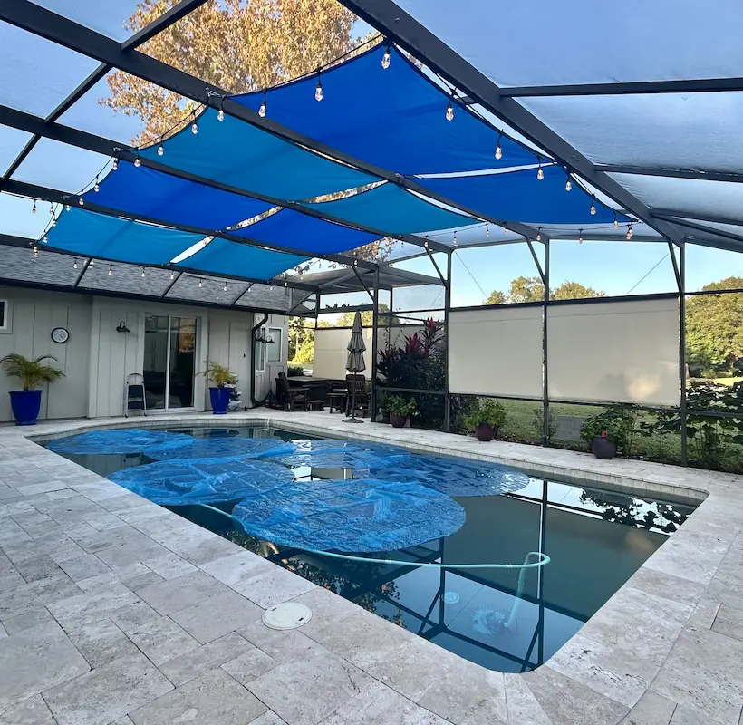 Complete pool enclosure coverage made with Sunbrella marine canvas.